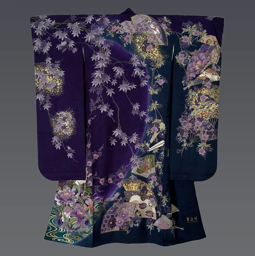 This exquisite furisode represents a masterful fusion of traditional Japanese textile artistry with contemporary design sensibilities, created by the legendary Kansai Yamamoto. The kimono showcases the sophisticated yuzen painting technique against a rich purple silk base, creating a dreamy, romantic aesthetic that bridges classical and modern artistic movements.