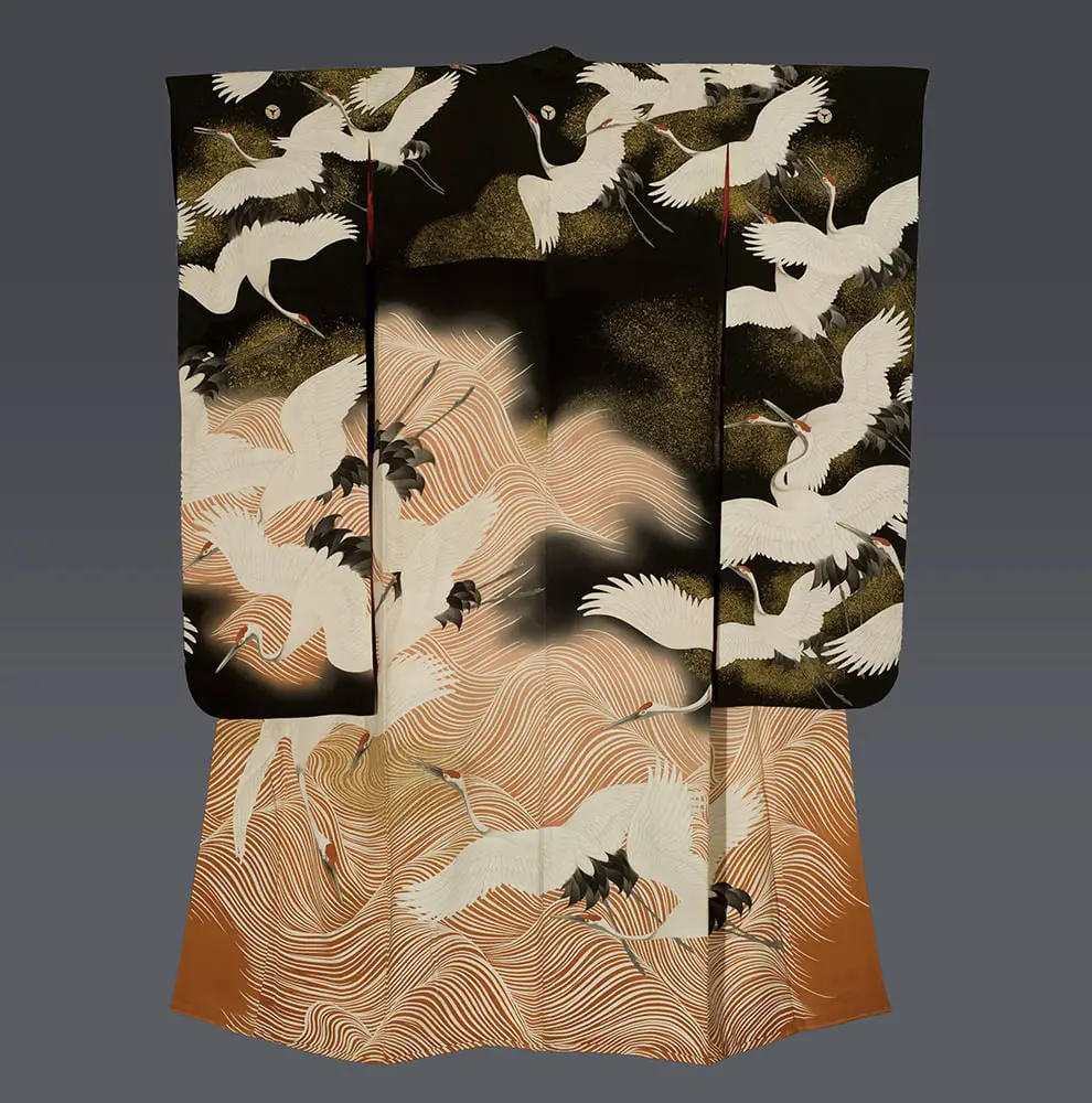 The artistic treatment reveals the influence of both traditional Rinpa school aesthetics and emerging modern sensibilities of the early 20th century. The flowing, undulating wave patterns that dominate the lower portion of the garment demonstrate the sophisticated use of negative space and rhythmic linear design that characterizes Japanese decorative arts. These stylized waves, rendered in coral and orange gradations, create a sense of perpetual motion that complements the soaring cranes above. The juxtaposition of the earthbound wave motifs with the airborne cranes creates a harmonious balance between different elements of nature.