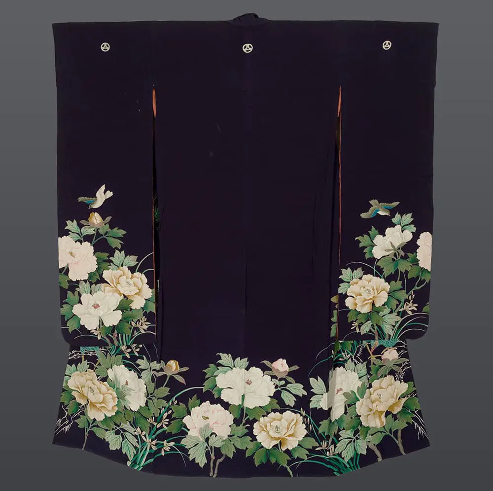 Symbolically, this kurofurisode operates as a complex visual poem celebrating fertility, beauty, and auspicious beginnings. The peonies, known as the "king of flowers," represent honor, wealth, and feminine beauty, while the spring orchids symbolize refinement and moral integrity. The nightingales herald the arrival of spring and new beginnings, making them particularly appropriate for bridal wear. The peacock feathers, with their distinctive ocellated patterns, traditionally represent watchfulness and nobility, while their exotic nature adds an element of worldly sophistication. Together, these motifs create a symbolic narrative of a bride's journey into married life, blessed with beauty, protected by vigilance, and graced with the promise of renewal and prosperity.