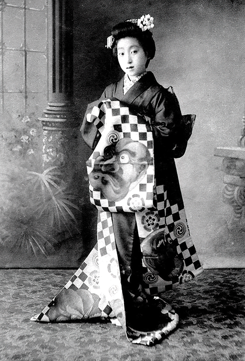 This extraordinary late Meiji period formal dancing kimono represents a sophisticated example of meta-theatrical textile art, where the garment itself becomes a stage for depicting the very performance culture it was designed to serve. The yuzen-painted scenes of geishas dancing and playing music create a remarkable recursive visual narrative—a kimono worn by performers that celebrates the art of performance itself, transforming the wearer into both participant and patron of the entertainment world. The checkerboard motif that serves as the compositional framework carries deep cultural resonance from the Edo period kabuki theater, where such bold geometric patterns became associated with the flamboyant aesthetic of actors who used striking visual elements to command attention and express their artistic personas.