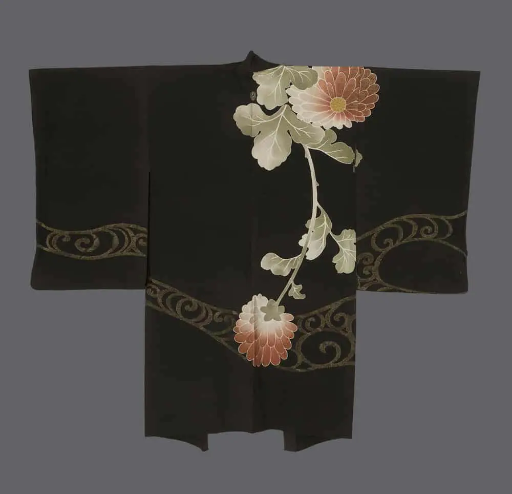 This haori features large yuzen-painted chrysanthemums, further enhanced by intricate metallic embroidery. The garment features a rich, deep black background that serves as a dramatic canvas for the exquisite floral design. Two large yuzen-painted chrysanthemums, rendered in soft peachy-pink tones with subtle gradations, dominate the composition. The chrysanthemums are accompanied by gracefully curving stems and leaves in pale, sage-like greens, creating an elegant, organic flow across the fabric. The placement of the larger bloom near the shoulder, with the stem extending downward, creates a sense of movement and draws the eye across the garment. The golden threadwork provides a beautiful contrast against the dark background and complements the delicate flower painting.