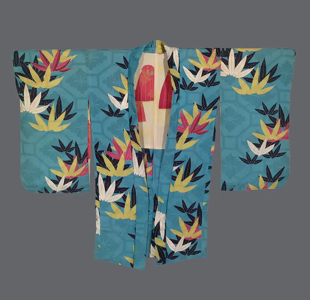 A stunning bamboo leaf pattern exemplifies the Japanese ability to abstract natural forms into striking graphic designs. The composition reveals bamboo leaves in a bold, modernist interpretation, rendered in yellow, white, black, and coral against a vibrant turquoise background. The background itself contains subtle, lighter kikko and floral patterns that enhance depth and sophistication to the overall design. The arrangement of the bamboo leaves creates a dynamic, asymmetrical pattern that guides the eye diagonally across the garment, demonstrating the Japanese design principle of flowing movement within a structured composition. The leaves appear to cascade and overlap, creating a sense of depth while maintaining the traditionally Japanese appreciation for flat decorative patterns. This design approach evokes aspects of Art Deco and modernist movements in its bold, geometric interpretation of natural forms. The color palette is particularly striking and modern, combining the turquoise background with bright yellow leaves, stark black elements, and occasional coral accents. The white bamboo leaves provide bright highlights that create additional visual interest and depth. This sophisticated use of color creates a vibrant, energetic design while maintaining visual harmony. The scale of the pattern is masterfully chosen, with the bamboo leaves large enough to make a bold statement while creating a balanced, repeating pattern that works harmoniously with the haori's form. The background's subtle self-figured patterns add an additional layer of visual interest without competing with the primary design elements, demonstrating the Japanese aesthetic principle of layered complexity within apparent simplicity.