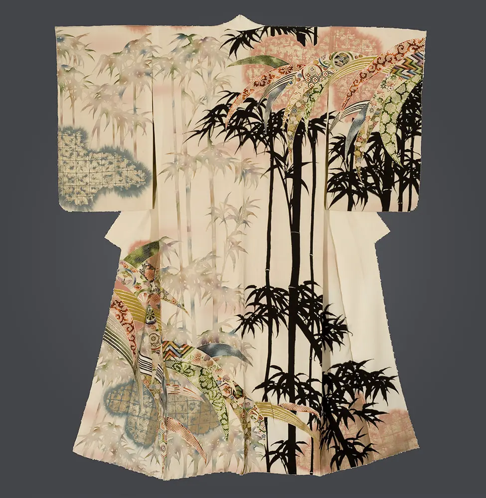 This chirimen silk kimono presents a masterful composition combining traditional bamboo motifs with contemporary artistic sensibilities. The design features dramatic black bamboo silhouettes against a soft cream ground, interwoven with flowing geometric patterns, delicate floral elements, and metallic foil accents created through yuzen-painting techniques.