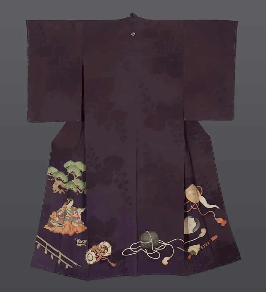 This silk irotomesode (type of formal kimono for married women) made from rinzu damask and kinsha fine crepe silk. The garment showcases exquisite yuzen painting technique depicting classical Heian period motifs against a rich purple ground.