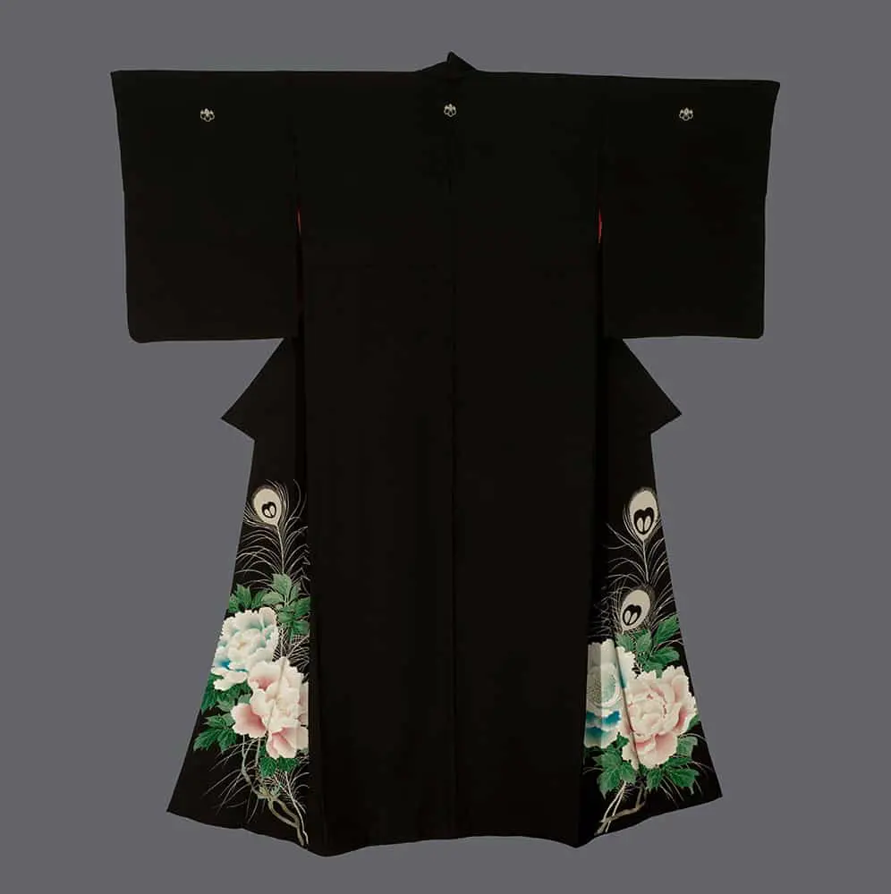 This elegant chirimen silk kurotomesode exemplifies the refined artistry of formal Japanese dress through its masterful combination of yuzen painting, metallic embroidery, and painted details. The design demonstrates a sophisticated understanding of negative space characteristic of traditional Japanese aesthetics, with the dramatic black ground serving as a canvas for an exquisite arrangement of peacock feathers and camellias positioned strategically at the hem. This placement follows the classical kurotomesode convention of concentrating decorative elements in the lower portion of the garment, creating visual weight and elegance appropriate for married women's formal wear.