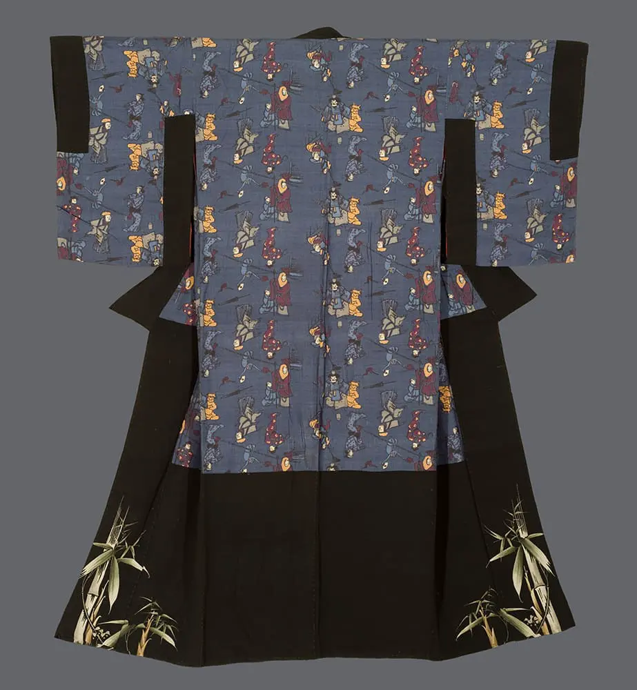 This dounuki features a distinctive two-toned design with a slate blue upper section decorated with repeating folk motifs and a deep black lower section adorned with delicate yuzen-painted bamboo in pale green and gold tones.