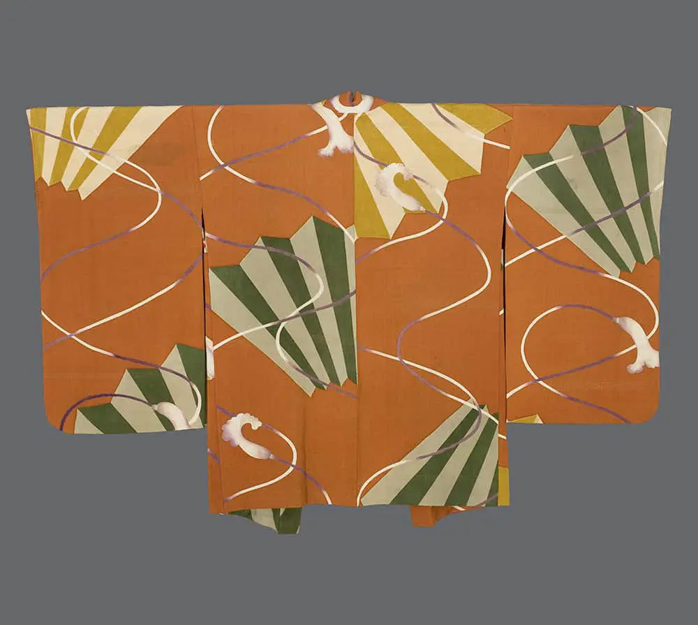 The kata-yuzen stenciling technique allows for precise rendering of these stylized fan forms, which carry profound cultural significance as symbols of prosperity, good fortune, and the gradual unfolding of life's possibilities. In Japanese aesthetics, the fan also represents the concept of spreading happiness and the ephemeral nature of beauty. The artist's interpretation transforms these traditional motifs into a thoroughly contemporary visual statement, with the fans appearing to dance and tumble through space, their geometric precision softened by the organic curves of the connecting streamers. The warm orange ground creates an atmosphere of celebration and vitality, while the sophisticated color palette of muted greens, soft lavenders, and cream speaks to the refined taste of Japan's cosmopolitan society during this period of cultural exchange and artistic innovation.