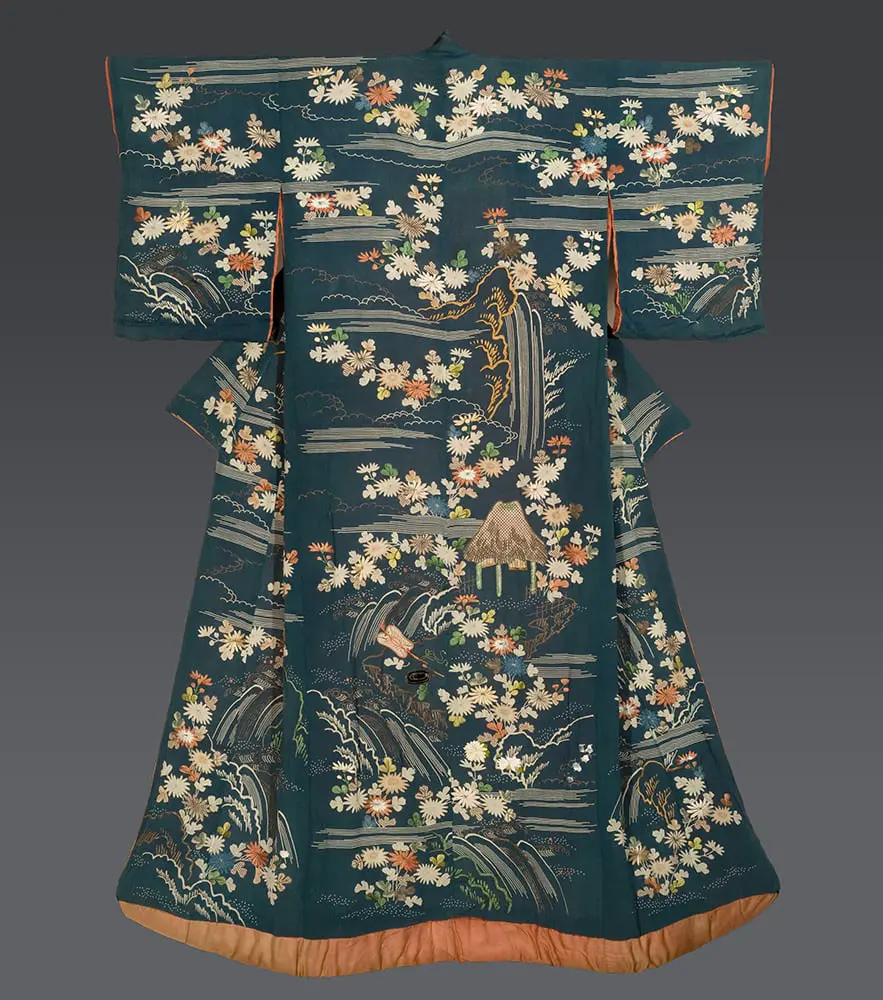 This chirimen silk uchikake embodies the sophisticated aesthetic sensibilities of Japan's samurai elite. The garment's deep teal ground serves as a luxurious canvas for an intricate narrative landscape that combines multiple decorative techniques - embroidery, yuzen painting, and couching - to create a richly textured surface that seems to shimmer with life. The composition skillfully balances densely embroidered chrysanthemums and other seasonal flowers with flowing waterfalls rendered in white silk threads, creating a dynamic interplay between botanical abundance and the power of rushing water.