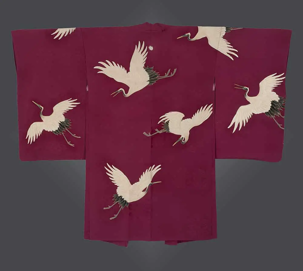This exquisite rinzu haori from the interwar period represents the pinnacle of Japanese textile artistry, synthesizing multiple sophisticated techniques to create a garment of remarkable aesthetic and technical achievement. The yuzen-painted cranes soar across a sumptuous burgundy silk ground with extraordinary naturalistic grace, their forms enhanced by delicate embroidered details and freehand painted accents that bring dimensionality and life to each bird's plumage. The gold foil outlining (surihaku) adds luminous definition to the crane silhouettes, creating a subtle shimmer that speaks to the luxury and refinement expected of high-status garments during this era of economic prosperity.